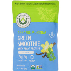 Meet Moringa: The Super Green More Nutritious Than Kale Nourishing You, Nourishing the World Add Water & Shake 8 g Protein | 3 g Fiber | 1 Cup Leafy Greens – Per Serving Smoothie Mix USDA Organic Non GMO Project Verified Plant-Based Vegan Gluten-Free Certified B Corporation* Certified Organic by QAIMake the Perfect Green Smoothie with MoringaA blend of simple ingredients, this delicious Vanilla Moringa Green Smoothie mix is boosted with a cup of nutrient-dense moringa greens, and is a good source of protein and fiber. Leafy Moringa Greens Pea Protein Brown Rice ProteinMeet Moringa: The Super Green More Nutritious than Kale*Moringa is one of the most nutrient-dense plants on the planet. 2 x Protein 4 x Iron 3 x Calcium 2.5 x Fiber*The moringa powder in one serving of this smoothie mix (5 g) versus one cup (16 g) of fresh, chopped kale. Comparative values for moringa powder and kale are respectively 1.5 g and 0.7 g protein. 76 mg & 24 mg calcium, 1 mg & 0.3 mg iron, 1.5 g & 0.6 g fiber.